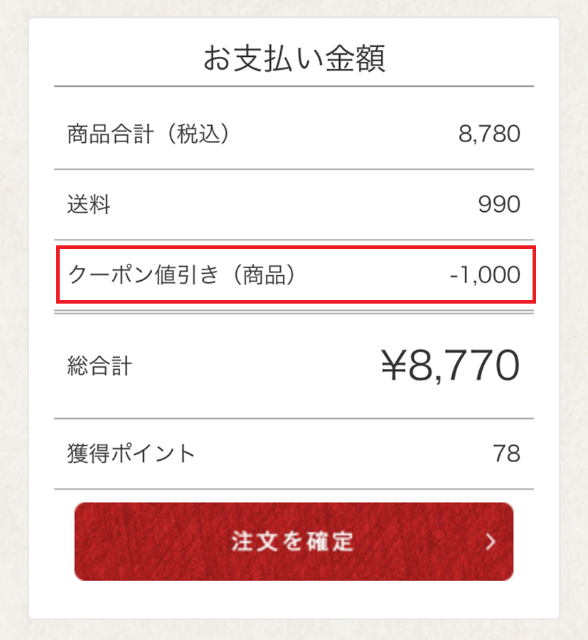 - お支払い金額画面でクーポンが適用されたことをご確認のうえ「注文を確定」を選択します。