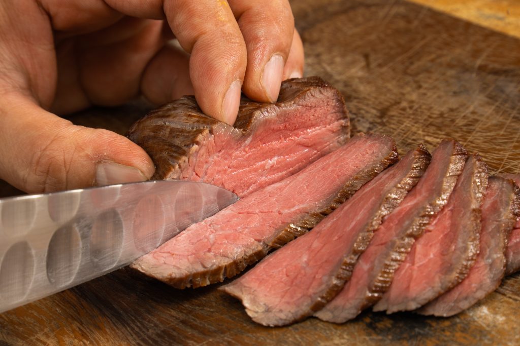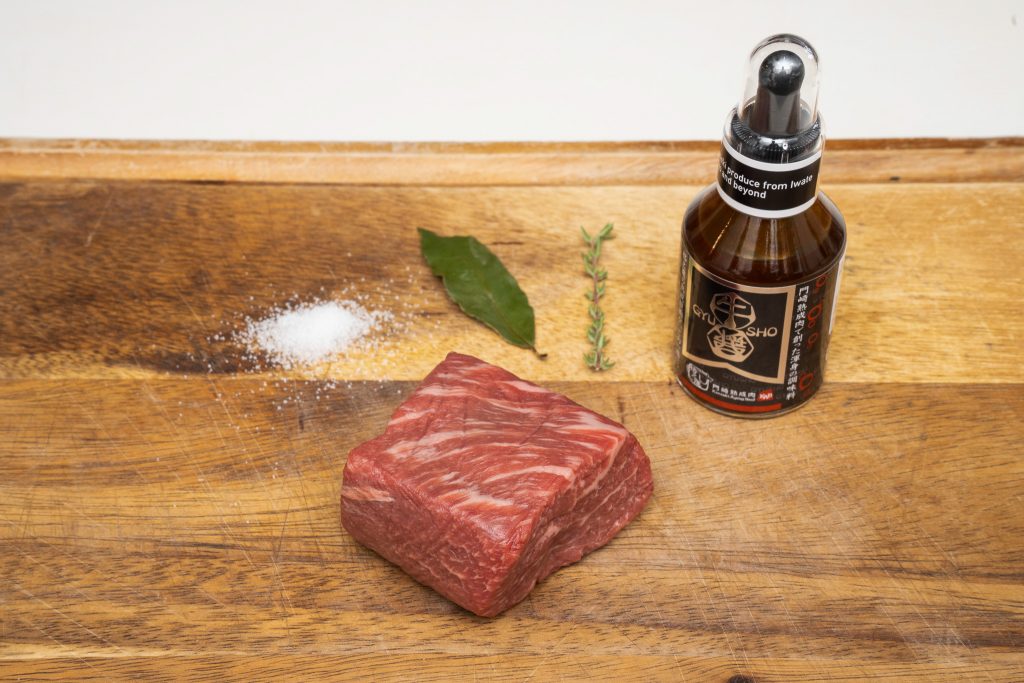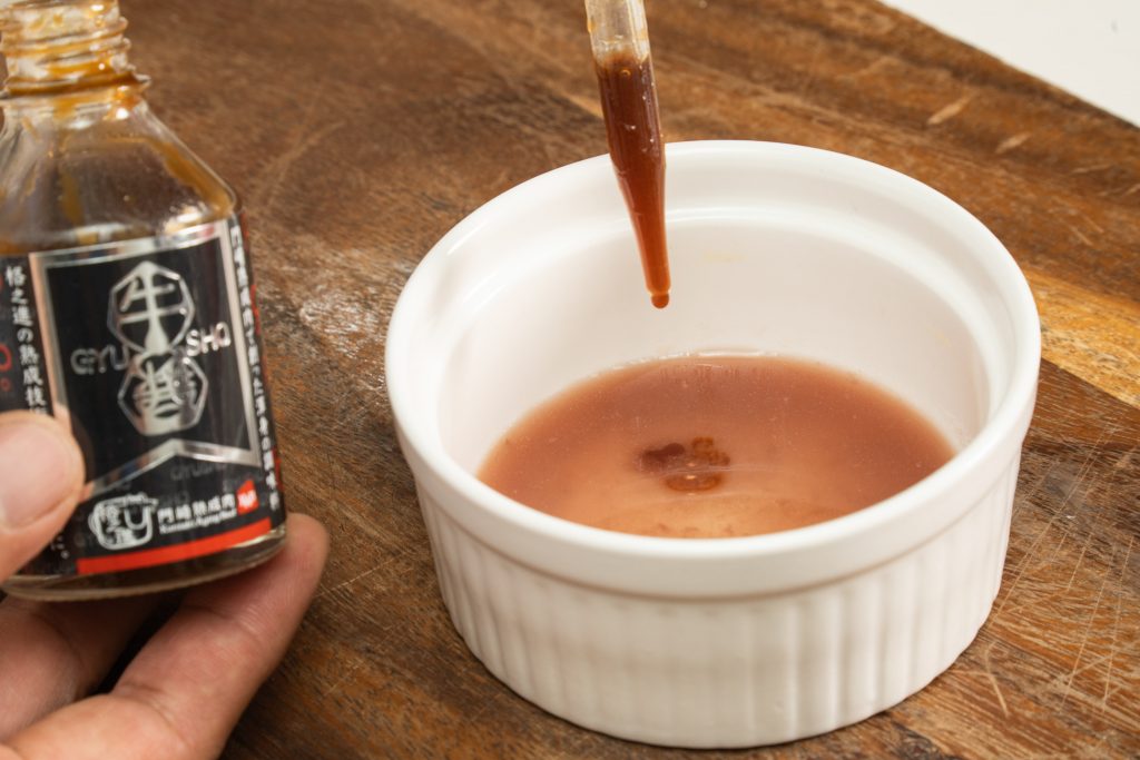- 120分後、フリーザーパックから塊肉を取り出す。袋の中に溜まった肉汁大さじ1に対して、牛醤を1滴加えてソースの完成!