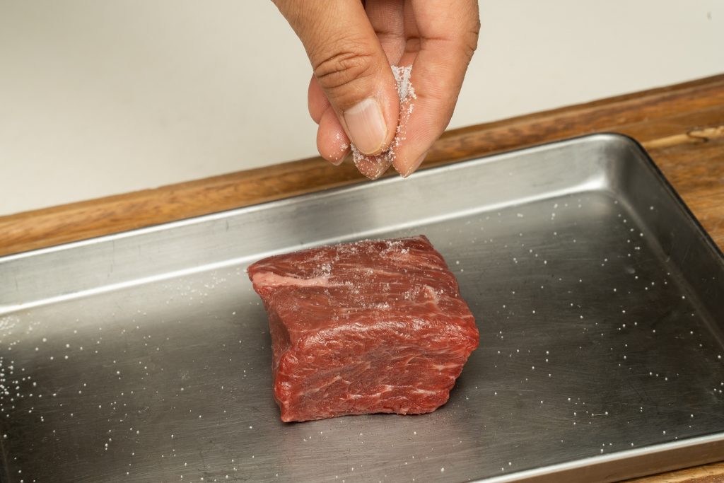 - 塊肉に塩とコショウを振る。(塩の量はお肉の1%が目安です)