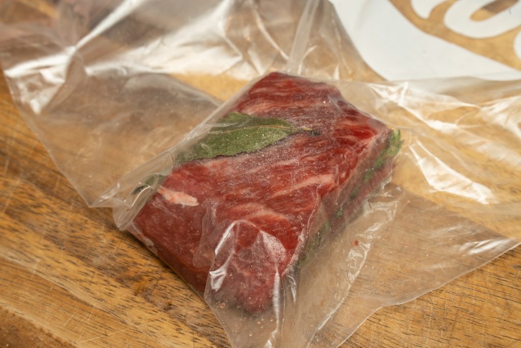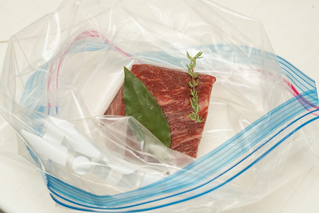 - フリーザーパックに塊肉を入れて、丁寧に空気を抜く。この時、お好みでハーブ(タイム、ローリエ、ローズマリーなど)を一緒に入れてもOK!