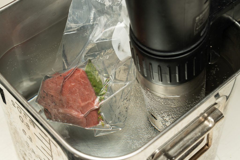 - 58℃のお湯の中にフリーザーパックを入れ、120分火を入れる。お湯が減りにくいように鍋にはラップをしておく。