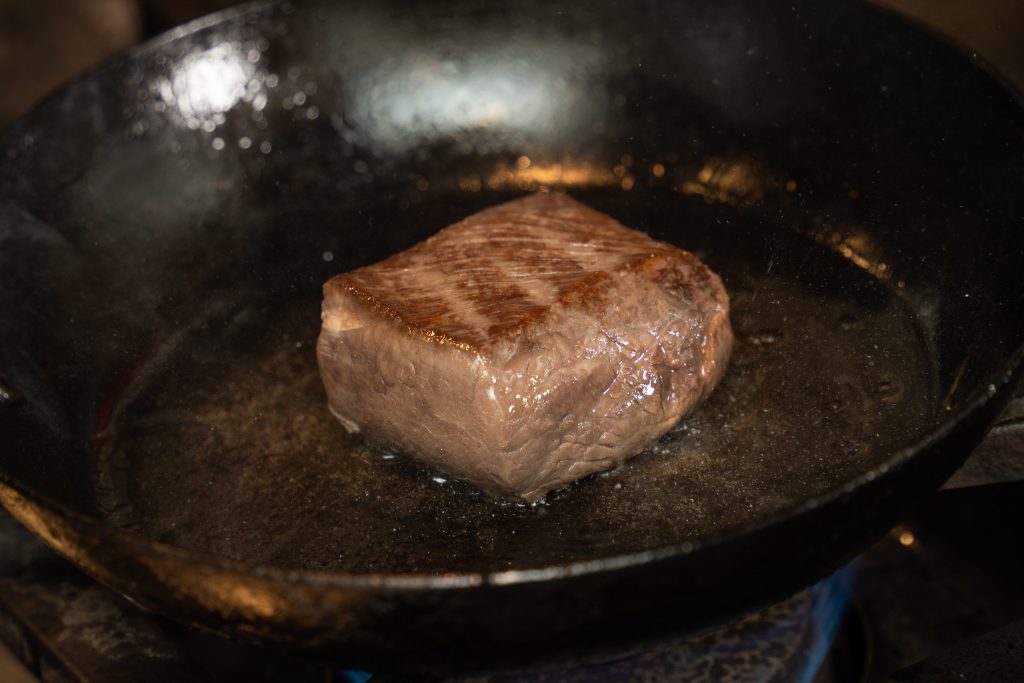 - 塊肉の表面を、強火で焼き付けるように焼き目を付ける。