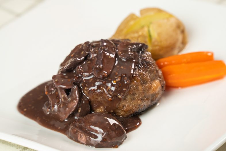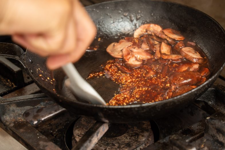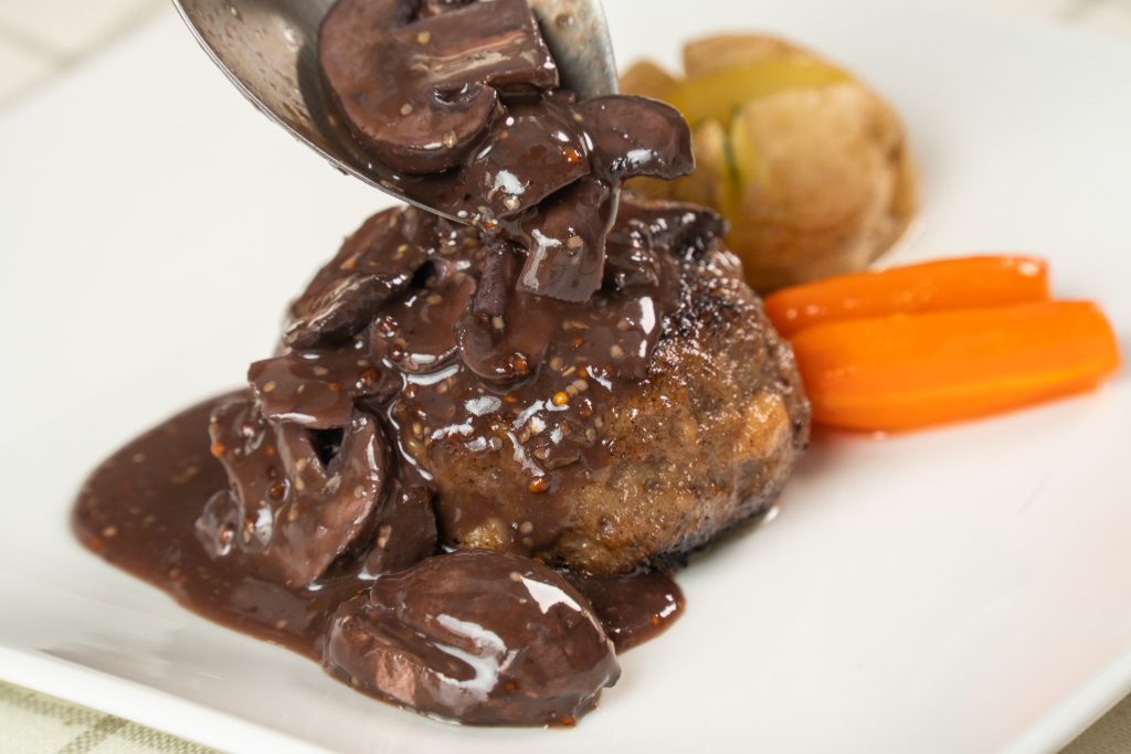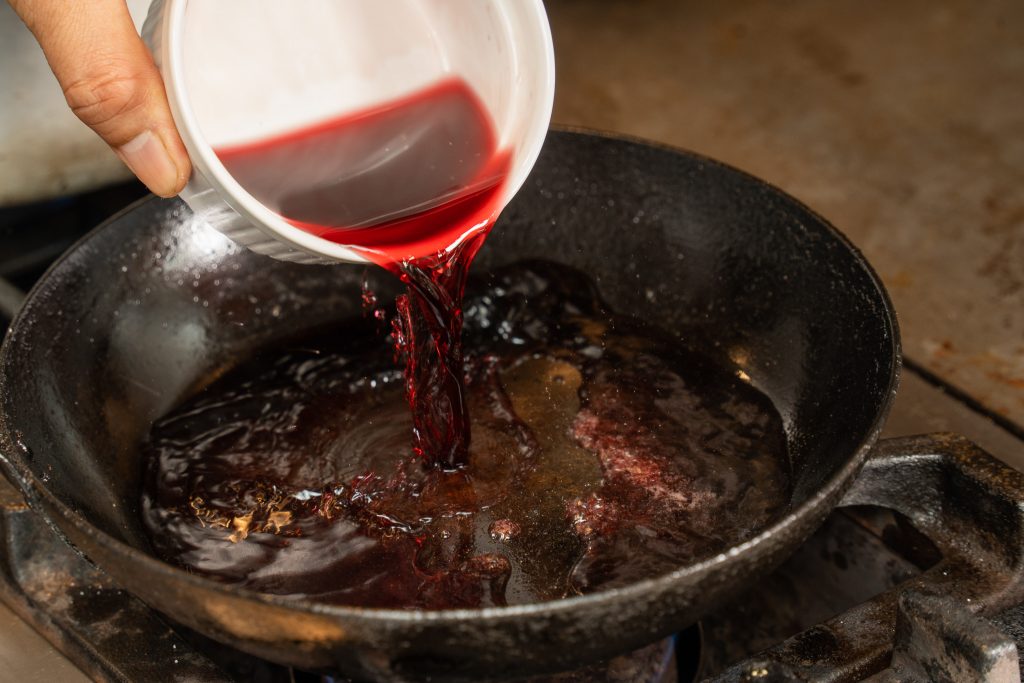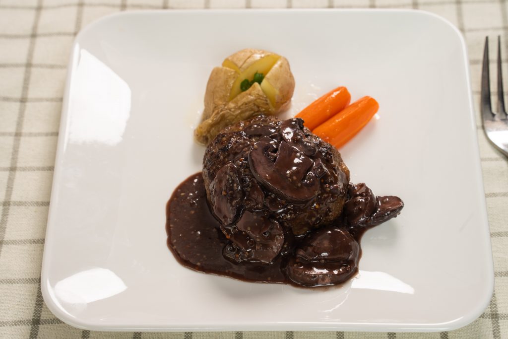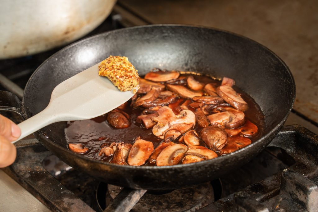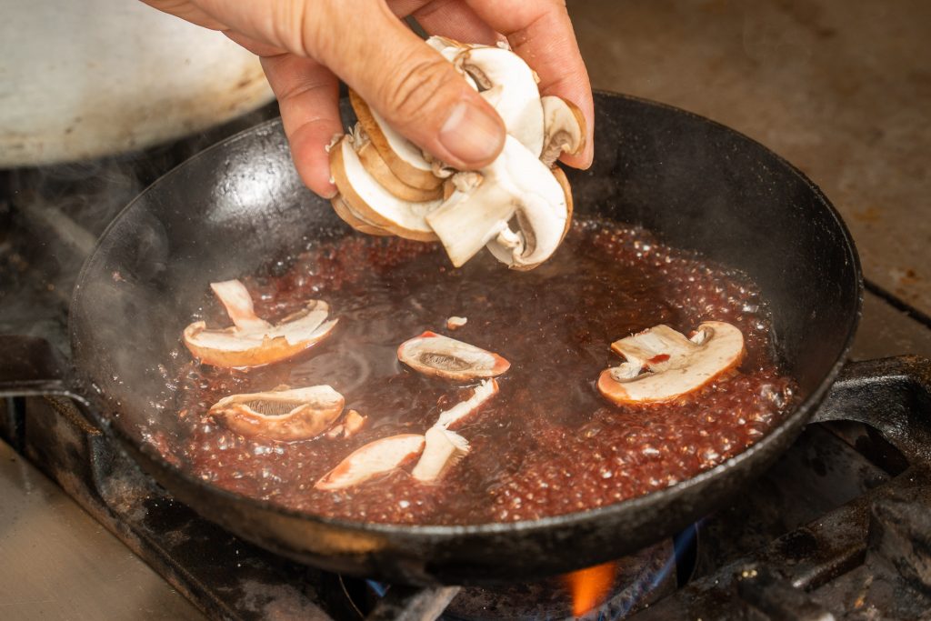 赤ワインを入れ軽く煮詰めたら、マッシュルームを加え、ケチャップと塩コショウ、牛醤で味を調える。