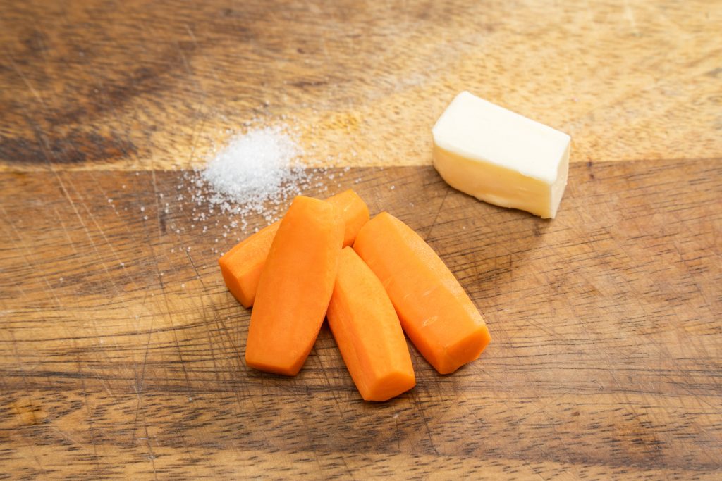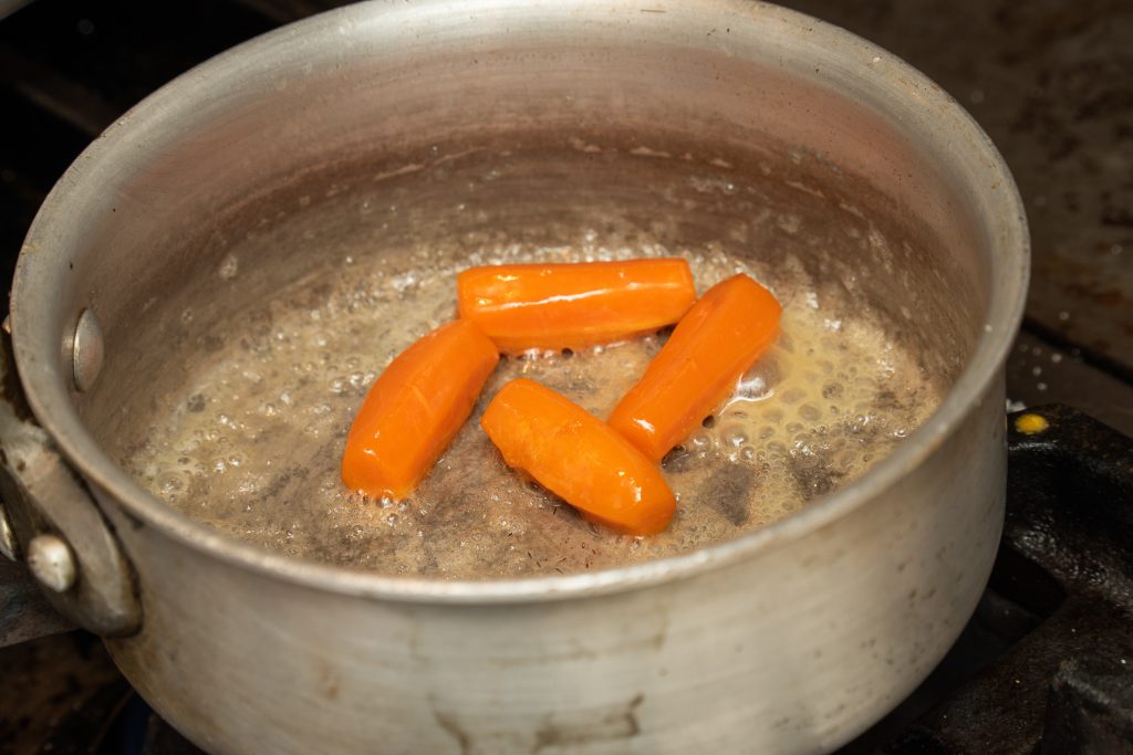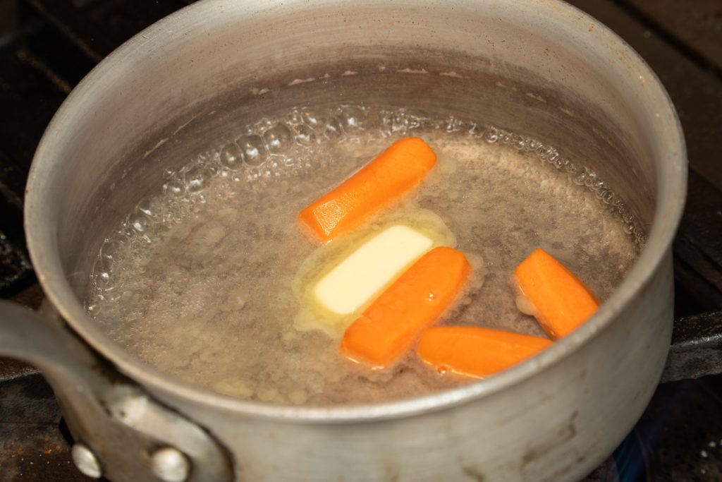 - 鍋ににんじんがかぶるくらいの水、バター、砂糖を入れ、にんじんが柔らかくなるまで茹でる。