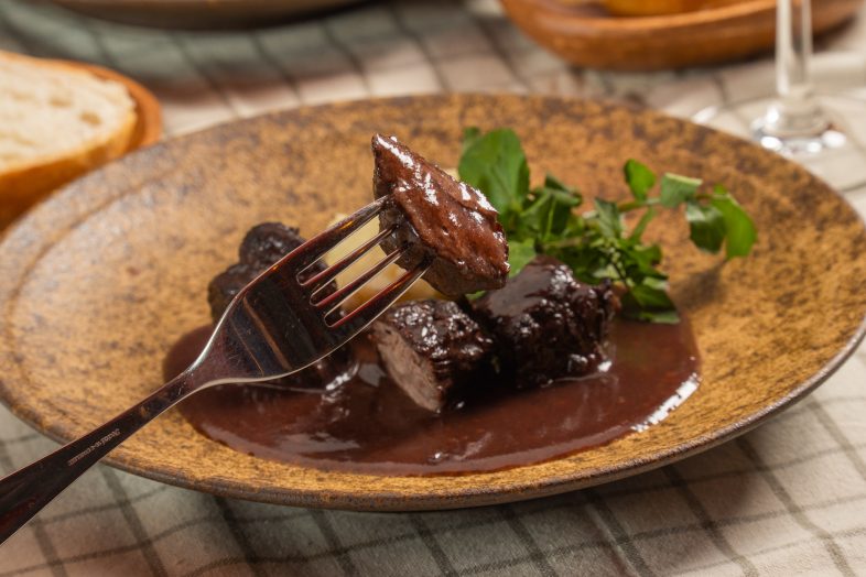 硬さのある「ネック」(牛の首元のお肉)は、コクがあり旨味も味わいも強いのが特徴的。煮込むと美味しいお肉には、低温調理が最適!ワインと一緒に楽しめる大人の一皿は、出来上がりの豪華さとは裏腹に難しい作業はありません。簡単レシピでごちそうのできあがり!