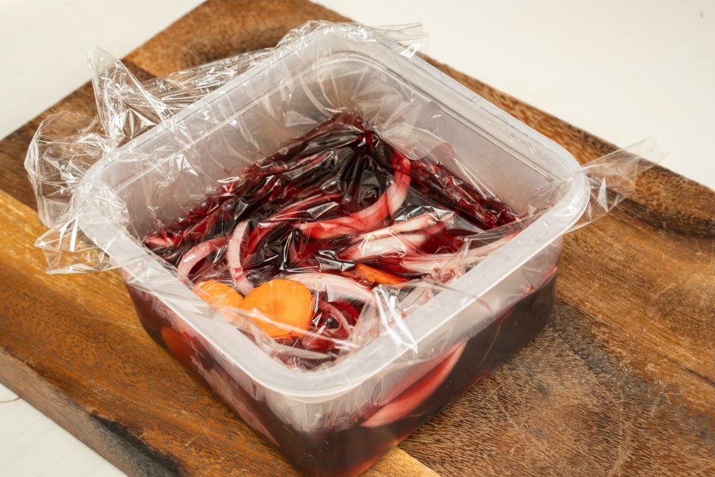 全てボールに入れ、赤ワインをひたひたに入れる。ラップをして一晩冷蔵庫で寝かせる。