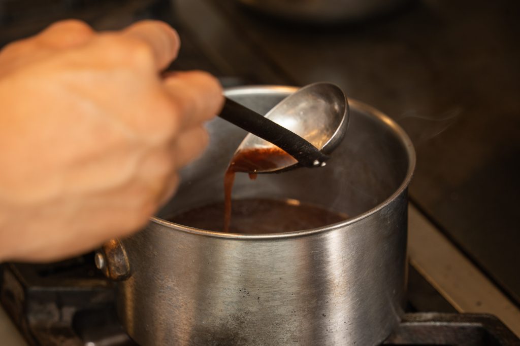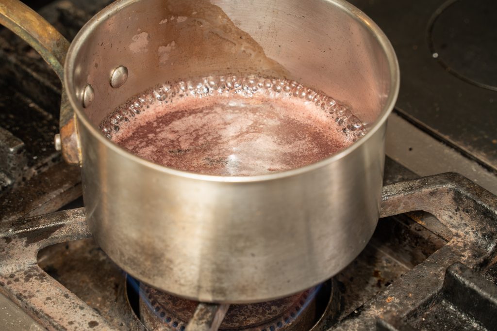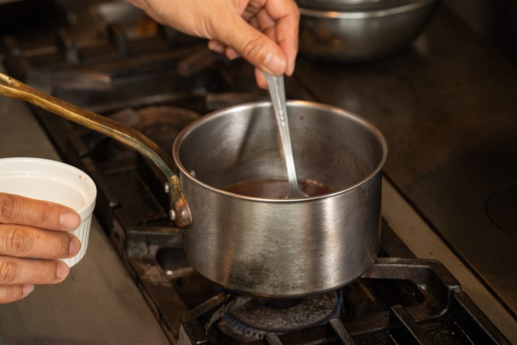 赤ワインの灰汁が残っていると、ソースが美味しく出来上がりません…。