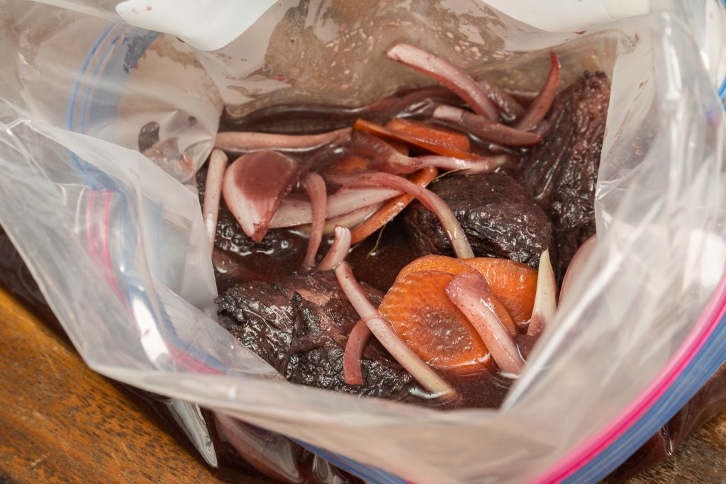 - 鍋の上でザルにあけて赤ワインを切り、お肉と野菜をフリーザーパックに入れる。