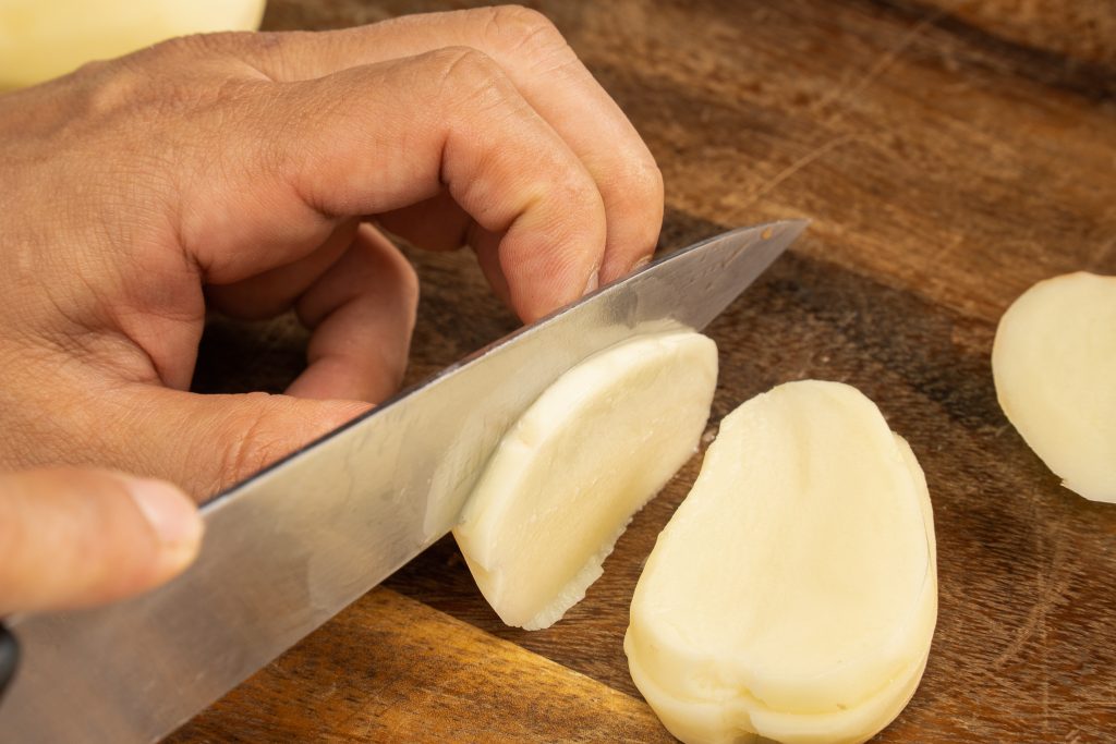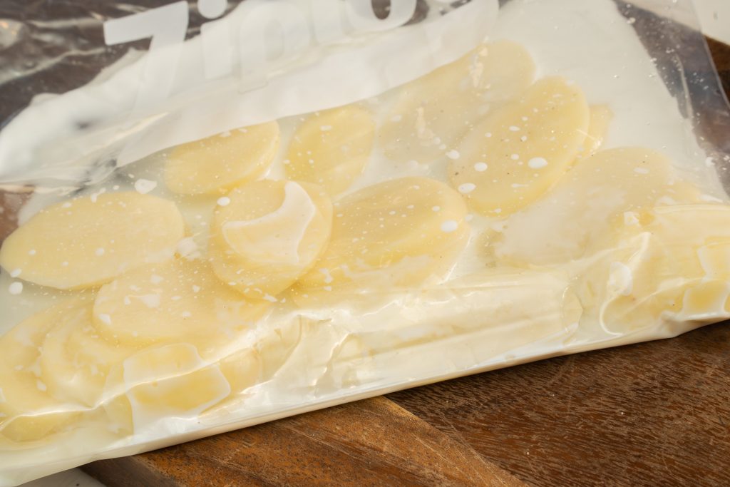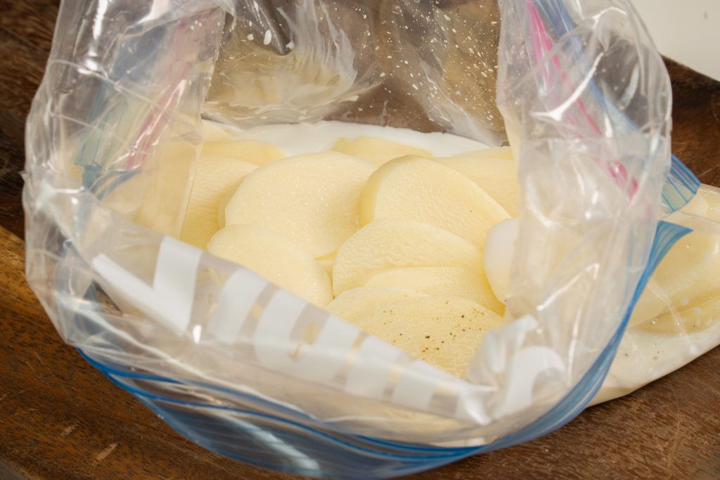 - じゃがいもは5ミリくらいのスライスにして、10分水にさらす。