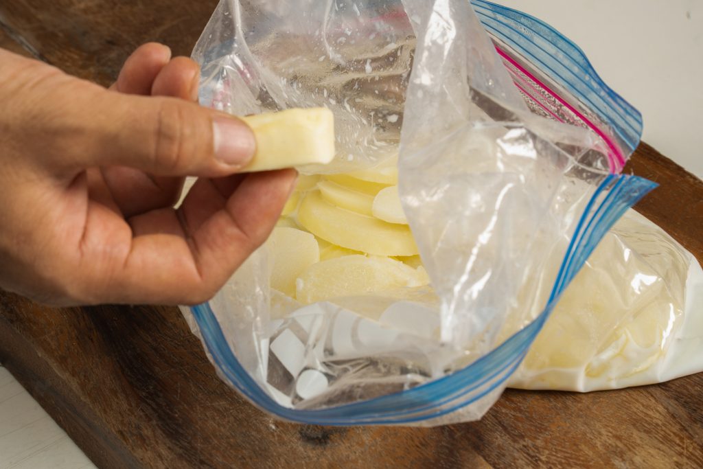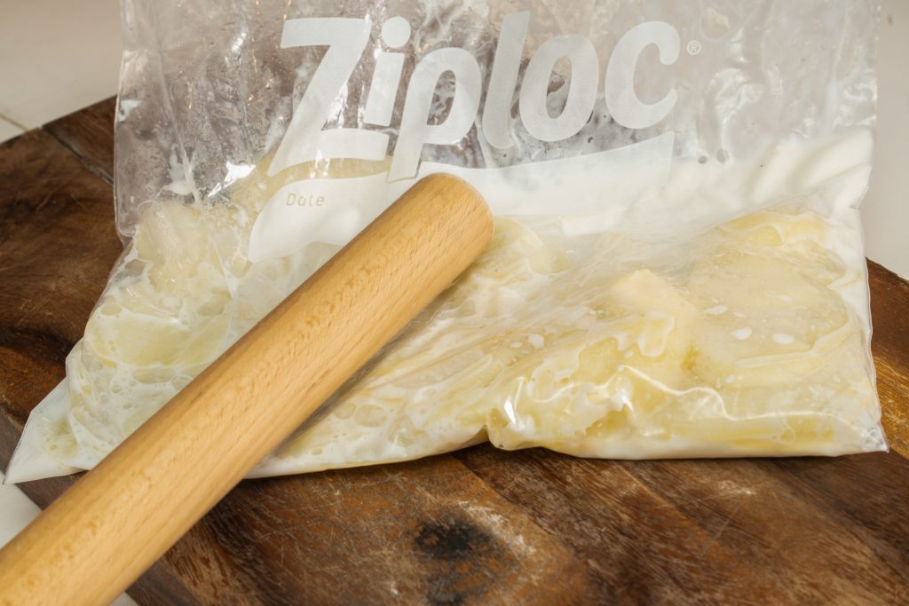- じゃがいものフリーザーパックを取り出し、バターを加え、麺棒でつぶす。