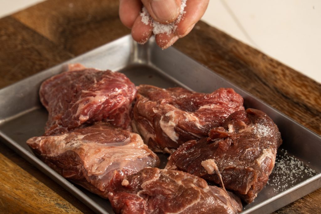 - お肉に塩を振り、フライパンで焼く