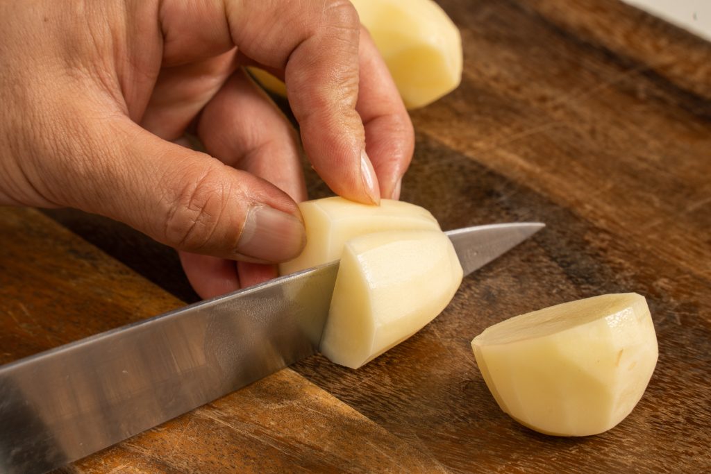 - 煮込み始めたら、野菜を一口大に切り、煮ている途中の鍋に野菜を加える。