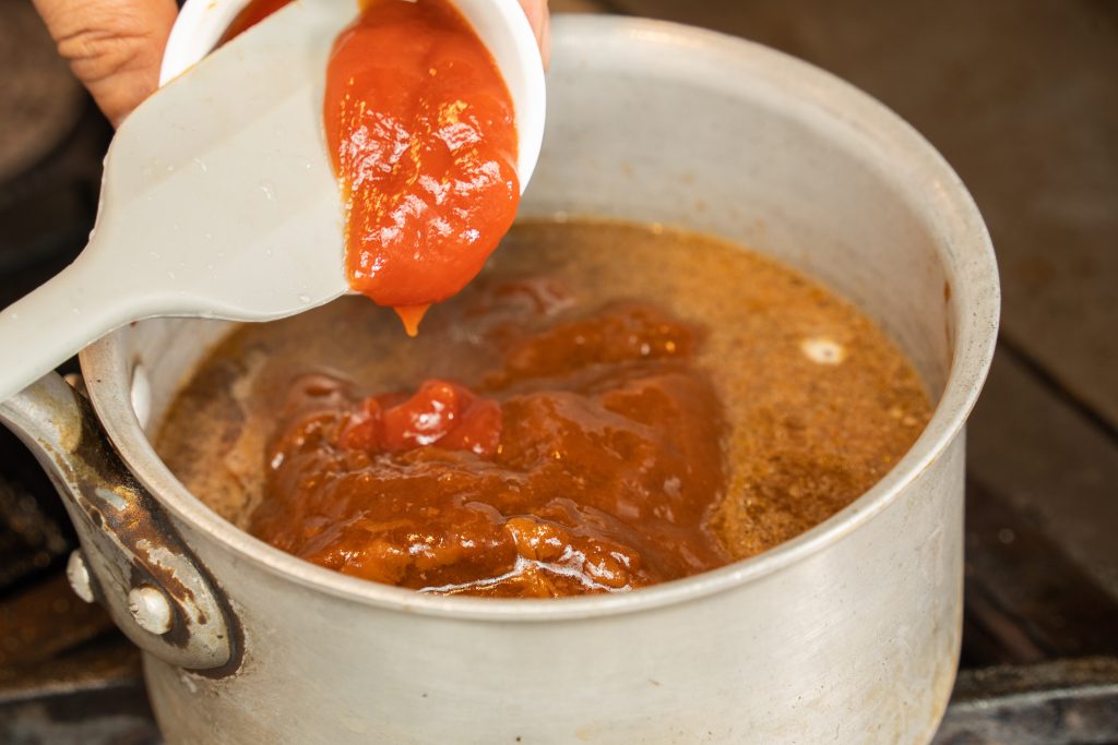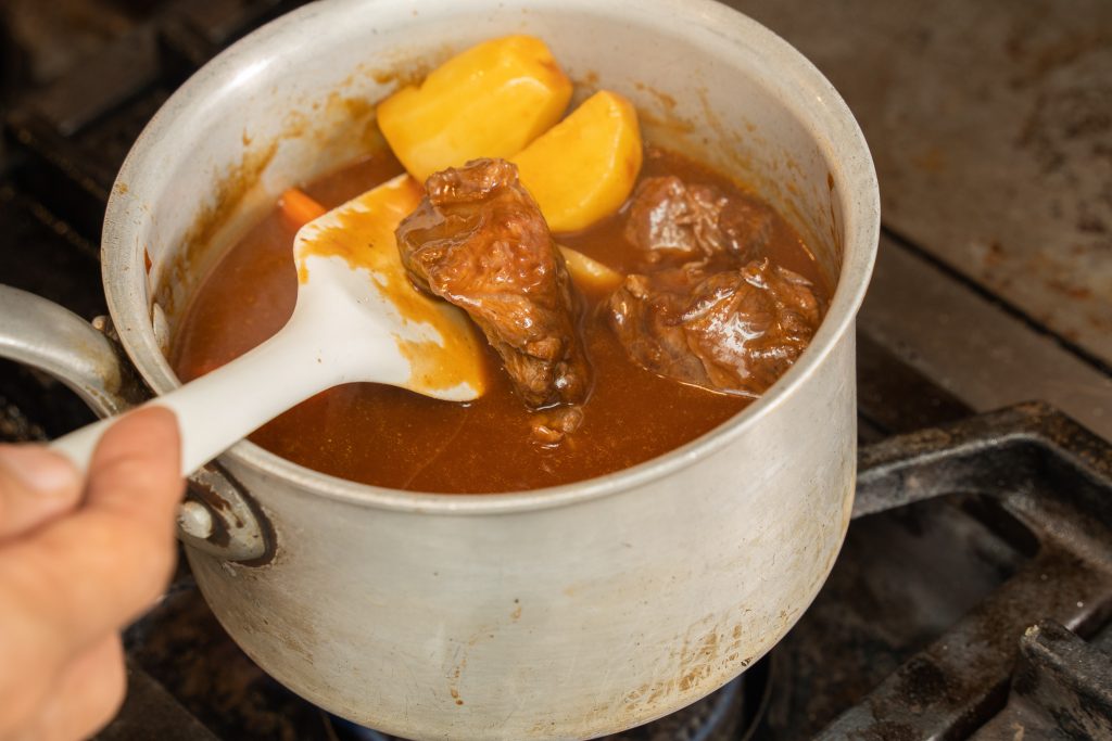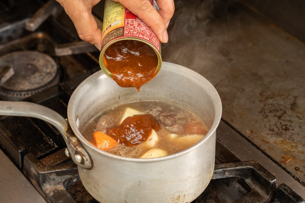 - お肉と野菜が柔らかくなったら、鍋にデミグラスソース缶とケチャップを加えればシチューの完成!