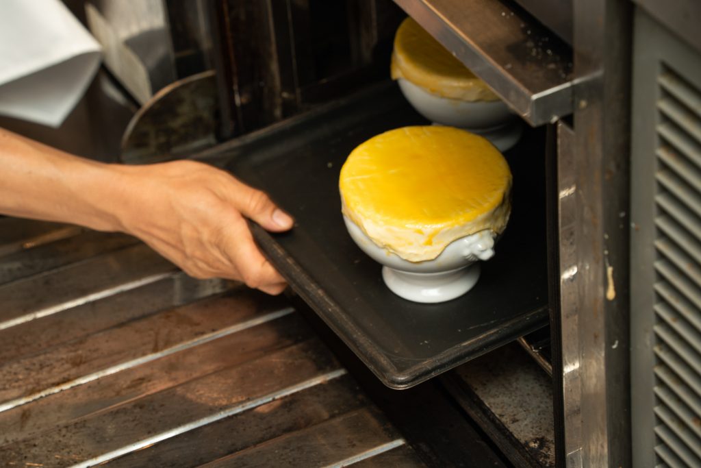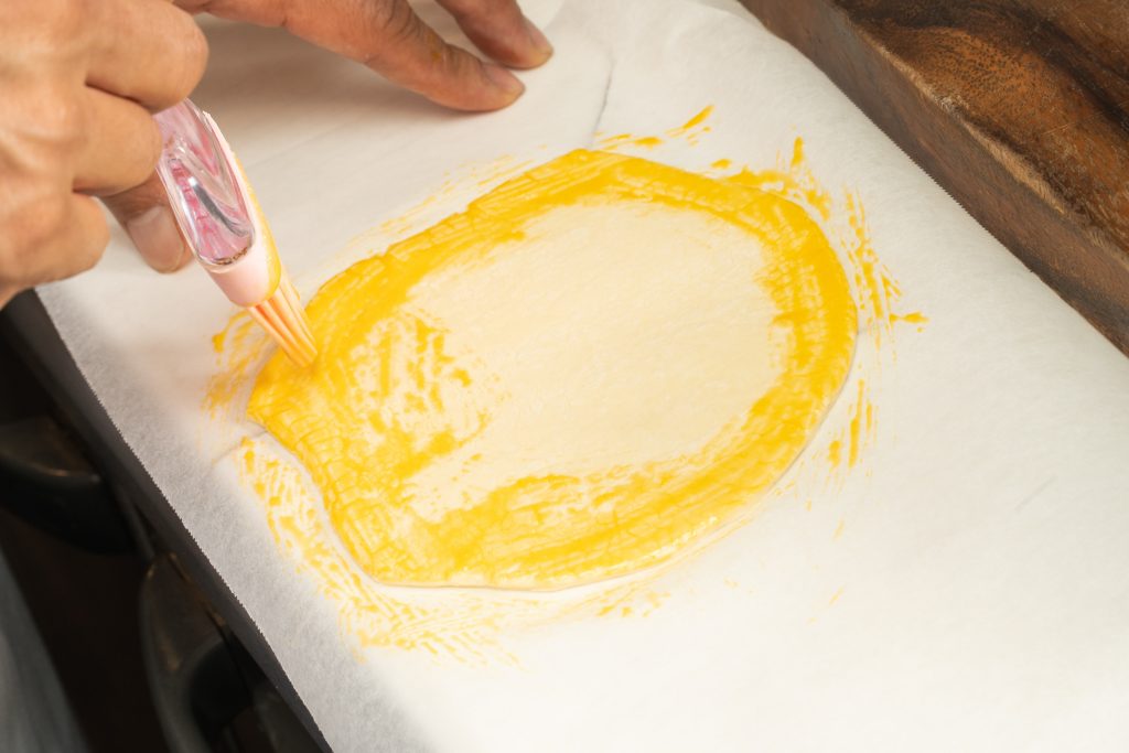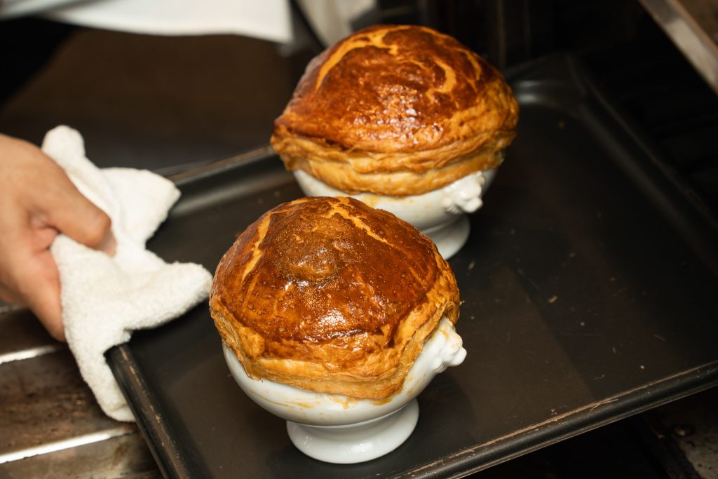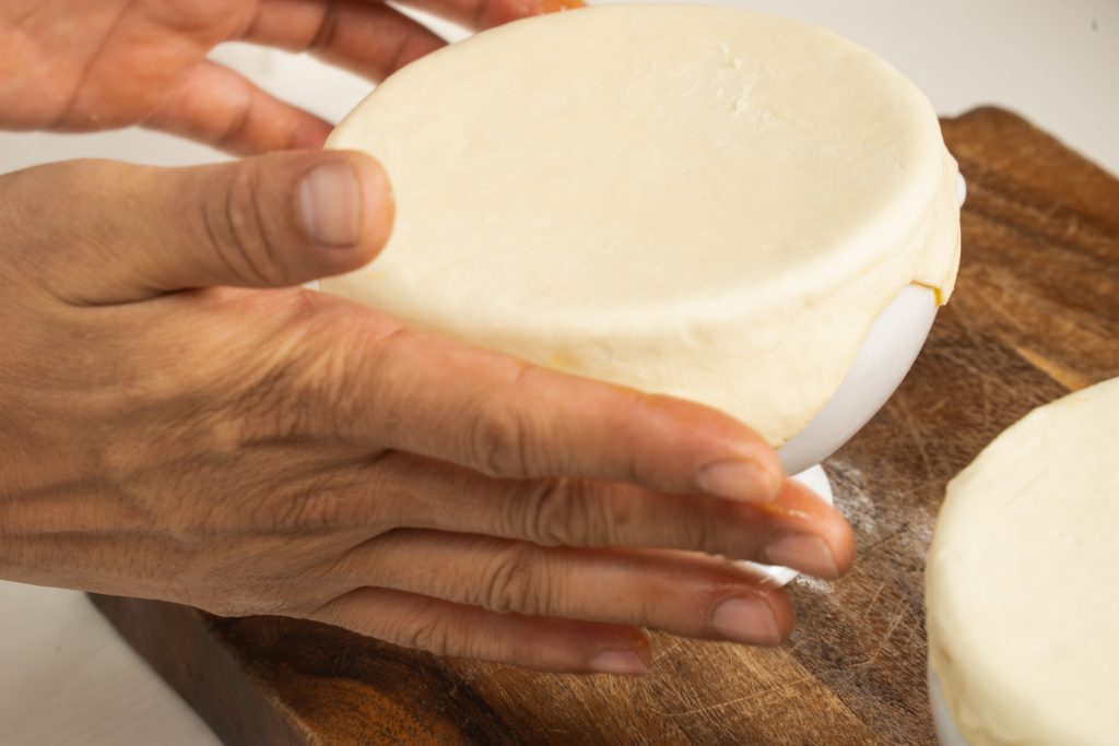 パイをしっかりとお皿に被せることで、綺麗に膨らみます。水で溶いた卵黄が、器とパイシートをくっつける接着剤の役割と、綺麗な焼き目を生み出します。