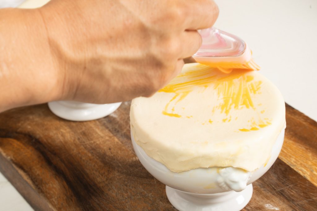 - 器に、冷やしたシチューを入れる。水で溶いた卵黄を、器に接する面のパイシートに塗りる。器にパイシートを被せたら、表面にも水溶き卵黄を塗る。