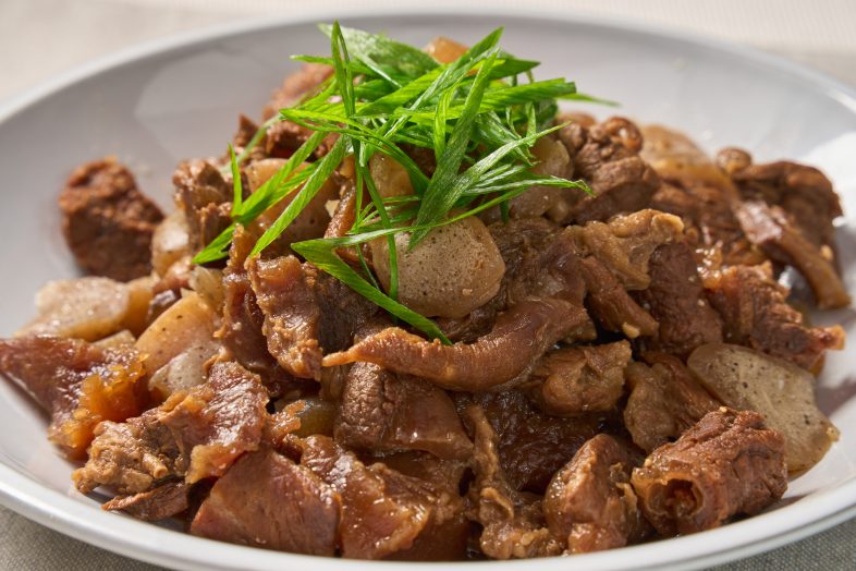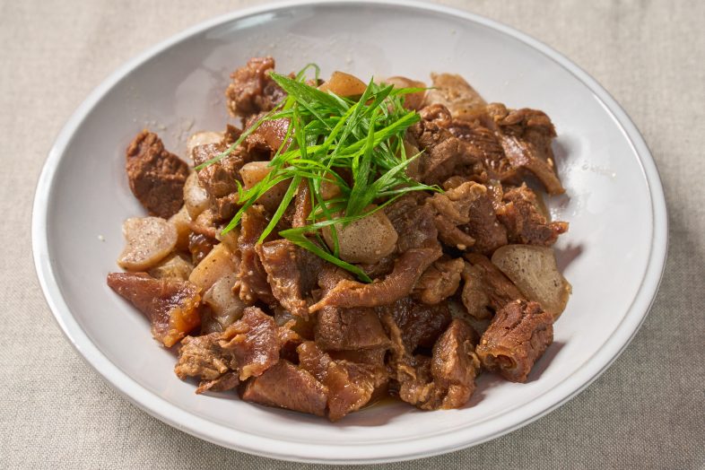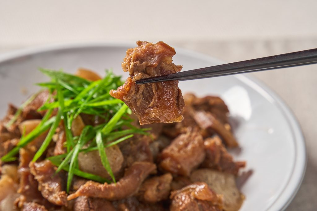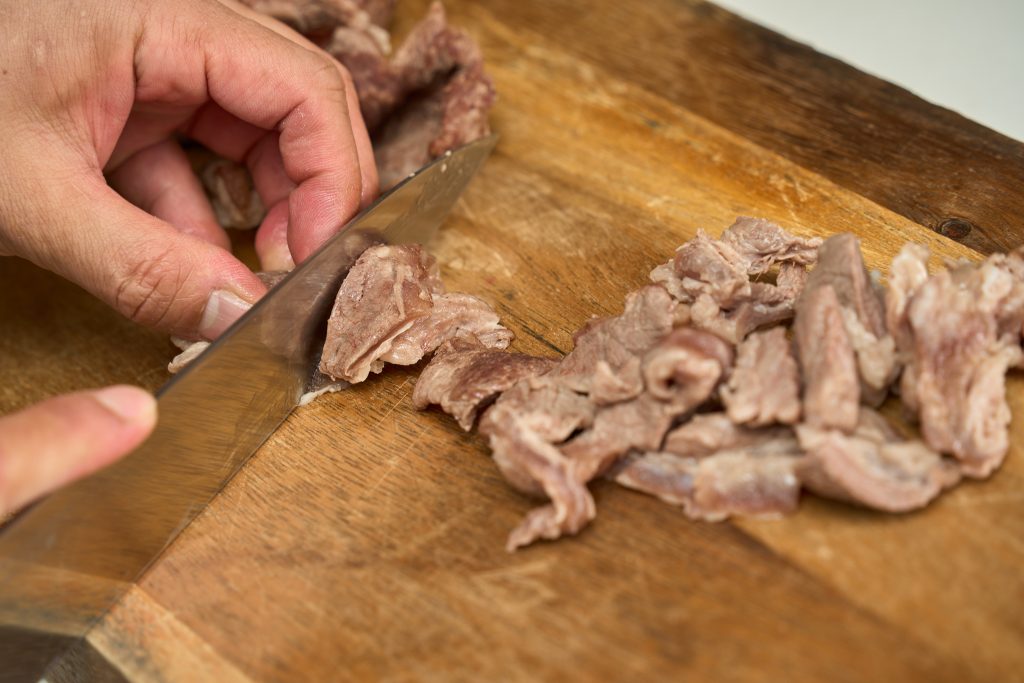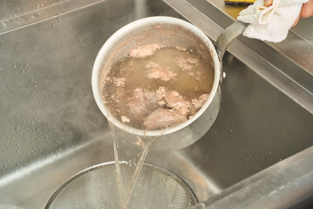 - 牛すじ肉をたっぷりの水から5分くらい茹でる(分量外)。ザルに開け、流水で灰汁を洗い流す。