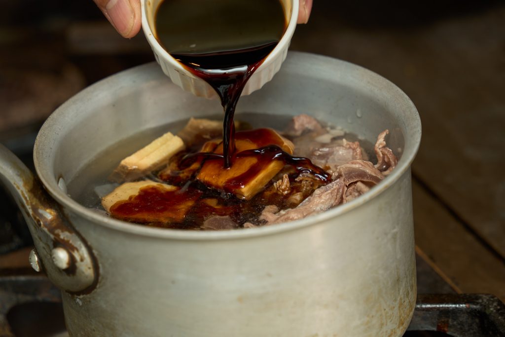 - 鍋に牛すじ、こんにゃく、生姜、水、醤油、酒、みりん、砂糖、水を加える。